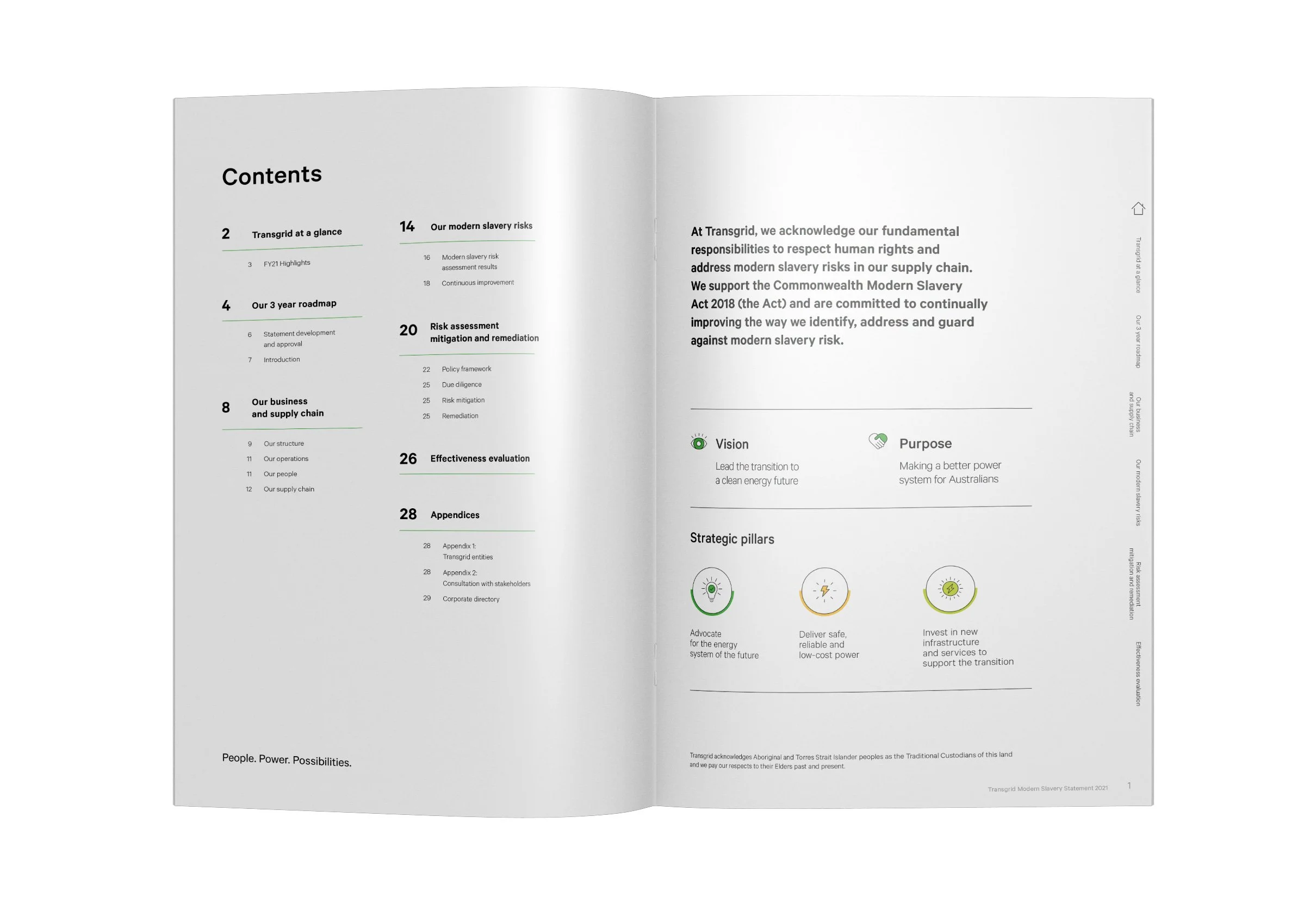 Pour Transgrid, gestionnaire du réseau électrique à haute tension en Nouvelle-Galles du Sud et dans le Territoire de la capitale australienne, j’ai développé une identité visuelle et des supports cohérents pour communiquer efficacement sur les pratiques liées à l’esclavage moderne. Mon rôle a été de traduire les exigences réglementaires et la vision de l’entreprise en une mise en page claire, structurée et professionnelle.
